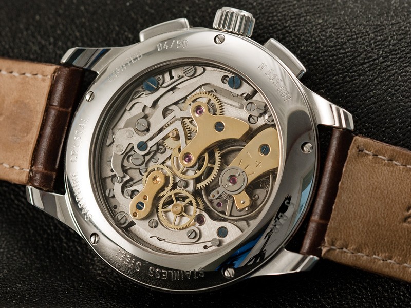 a mechanical winding chronograph movement calibre Landeron 248. Stainless steel case with observation back, sapphire crystal, brown color dial, brown leather band