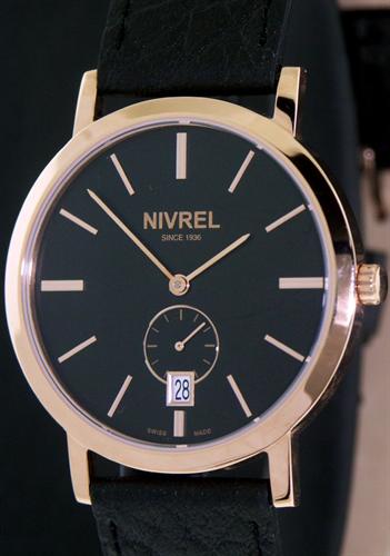Black dial, high polished rose gold pvd stainless steel case in a ultra-slim under 6.00mm profile. Genuine sapphire crystal. Powered by a Swiss ETA Quartz movement. Nivrel factory model number NE.1050.1KASOS.