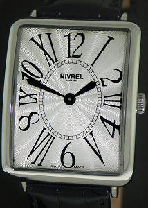 Nivrel Ladies Quartz wrist watch. Swiss Quartz movement, rectangular stainless steel curved large case. Silver color Sunburst Guilloche textured dial with large Arabic and Roman printed numerals. Black leather watch band.