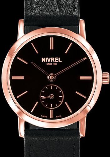Nivrel Ladies Quartz wrist watch. Swiss Quartz movement, stainless steel elegant rose gold plated case. Black dial with small seconds sub-dial at 6 o`clock. Black leather watch band.