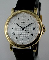 Nivrel Gold Mechanical wrist watch. Swiss ETA Automatic movement with 21 jewels and Cotes de Geneve hand enhancements. 18KT solid gold case with black Alligator watch band, ivory Guilloche textured dial with Roman printed numerals and date calendar.