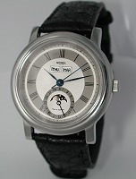 Nivrel Swiss Mechanical Automatic wrist watch. Watch Functions: Moon Phase indicator; Date Pointer hand; Day/Month calendar. Guilloche textured silver color dial with ivory color ring and Roman numerals. Stainless steel case with observation case back and ostrich leather watch band.
