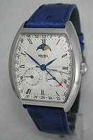 Nivrel wrist watch with Moon Phase indicator, Date, Day and 52 weeks Pointer hands. Swiss Mechanical Automatic ETA 2898-2 movement. Guilloche textured silver color dial with Roman numerals, polished stainless steel tonneau shaped case with observation case back. Blue ostrich leather watch band.