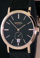 Nivrel Ladies Quartz wrist watch. Swiss Quartz movement, stainless steel elegant rose gold plated case. Black dial with small seconds sub-dial at 6 o`clock. Black leather watch band.