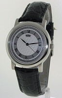 High polished stainless steel 38mm case in a ultra-slim profile. Sapphire crystal. Powered by a Swiss ETA Quartz movement. Silver color guilloche pattern dial. Nivrel factory model number N09.001AAABS.