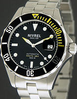 Nivrel South Sea watch from Nivrel Diving Watches Collection. 300 meters water resistant. Swiss ETA Cal. 2824-2 Automatic movement with date calendar and sweep-second functions. Black dial with large luminous markers. Stainless steel, uni-directional 0-60 rotating bezel with yellow color sector, screw-down crown and case back. Stainless steel watch bracelet with deployment buckle and security clasp with band extension so it can be worn over a diving suit.