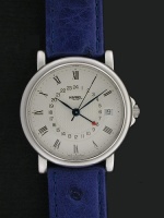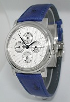 Watch Functions: date indicator; day indicator; month indicator; the leap year indicator; 24 Hours hand. Perpetual Calendar is programmed until the year 2099. 24 hour hand is used as a second time zone. Swiss ETA Cal. 2892-2 21 Automatic movement. Beautiful Guilloche textured dial with blued hands. Blue Ostrich leather watch band.