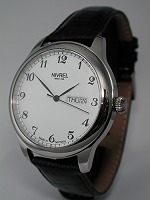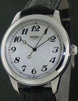 Nivrel manual wind wrist watch powered by ETA 6498 movement with swan`s neck fine adjustment. Large 42mm steel 316L case with transparent back, white enamelled looking dial with large Arabic numerals. Small seconds sub-dial at 5 o`clock position. Black leather watch strap.