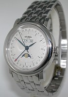 Nivrel German wrist watch with Moon Phase indicator, Date Pointer hand and Day/Month calendar. Swiss Mechanical Automatic ETA 2892-2 movement with calendar module from Dubois-Depraz. Guilloche textured silver color dial, polished stainless steel case and watch bracelet, observation case back. Available with ostrich watch band.