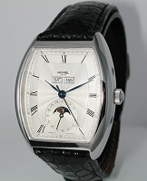 Nivrel wrist watch with Moon Phase indicator, Date Pointer hand and Day/Month calendar. Swiss Mechanical Automatic ETA 2898-2 movement. Guilloche Sunburst textured silver color dial with Roman numerals, polished stainless steel tonneau shaped case with observation case back. Black leather watch band.