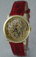 Nivrel fully skeletonized Automatic wrist watch. Gorgeous hand skeletonized gilt color plated ETA 2892-2 21 jewels Swiss Automatic movement, blued hands and red crocodile strap. 18KT gold case with screw down crown and observation case back.