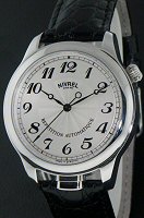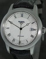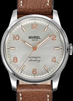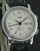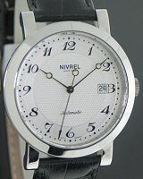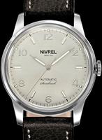 Nivrel Horaire Automatique model. Swiss ETA Cal. 2824-2 Automatic movement with date calendar. Silver color dial with Arabic printed numerals. Stainless steel polished and satin finished case with observation crystal. Black leather band