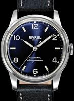 NIVREL`s anniversary edition. Limited to 200 pieces. The Coeur de la Sarre has the same design as most vintage NIVREL three-hand watch models: round case, domed glass, and a dial with Arabic numbers at even positions. Swiss ETA Cal. 2824-2 Automatic movement. Blue color dial with super-luminova hand and markers. Stainless steel case with observation crystal. Black leather band