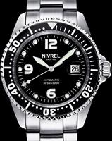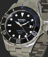 Nivrel "Deep Ocean" N145.001CASDB model from Nivrel Diving Watches Collection. 500 meters water resistant. Swiss ETA Cal. 2824-2 Automatic movement with date calendar. Black dial with large luminous markers. Stainless steel case with observation crystal, uni-directional 0-60 rotating bezel, screw-down crown and case back. Stainless steel watch bracelet with deployant buckle and security clasp with band extension so it can be worn over a diving suit.