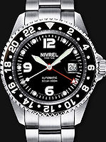 Nivrel "Deep Ocean" N146.001CASDB model from Nivrel Diving Watches Collection. 500 meters water resistant. Swiss ETA Cal. 2836-2 Automatic movement with date calendar and second time zone hand. Black dial with large luminous markers. Stainless steel case with observation crystal, uni-directional 0-60 rotating bezel, screw-down crown and case back. Stainless steel watch bracelet with deployant buckle and security clasp with band extension so it can be worn over a diving suit.