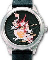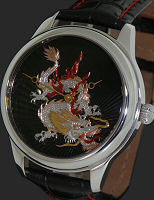 Nivrel Black Dragon Automatic watch. Polished stainless steel case with observation back. Hand engraved automatic ETA 2824 movement. Black Guilloche dial with hand engraved dragon in yellow gold, rose gold, white gold and red colors.