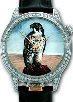 Nivrel Repetition Peinture Falcon 2009 that is hand-painted by artists in Germany. Watch powered by Nivrel version of automatic ETA 2892-A2 movement with hand-engraved and hand-skeletonized repeater module. Stainless steel case with diamonds on the bezel and lugs, observation back, sapphire crystal, leather strap