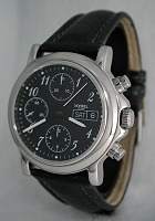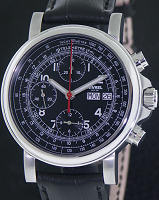 Nivrel Automatic chronograph watch with "La Grande Date". Polished stainless steel case with observation case back. Swiss Automatic ETA 2892-2 chronograph movement with 21 jewels and Cotes de Geneve enhancements. "Grande Guichet" large date calendar at 12 o`clock position. Two separate discs/month. Black color Guilloche textured dial with Roman markers.