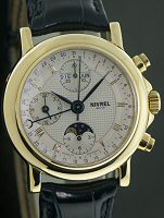 Nivrel Automatic chronograph watch. Polished 18KT gold case with observation case back. Swiss Automatic ETA/VALJOUX 7751 chronograph movement with 25 jewels and Cotes de Geneve enhancements. Watch Functions: Chronograph, 24 hour hand; Day/Month calendar; Moon Phase indicator; Date Pointer hand. Silver color Guilloche textured dial with Applied polished Gilt color markers.