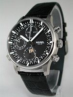 Nivrel Flieger chronograph. Solid Stainless steel case with observation case back and screw-down crown. ETA/VALJOUX 7750 25 jewels Swiss Automatic chronograph movement with Cotes de Geneve enhancements. Black color dial with day/date calendar and Arabic markers. Black leather watch band.