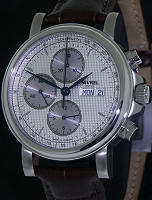 Nivrel Heritage Grand Chronographe. Solid 316L stainless steel case with observation case back and screw-down crown. ETA/VALJOUX 7751 25 jewels Swiss Automatic chronograph movement with Cotes de Geneve enhancements. Silver color dial with Clous de Paris guilloche texture and day/month calendar, moon-phase calendar and date pointer hand. Brown Lousiana Alligator leather band.