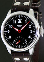 Nivrel Aviateur manual wind wrist watch powered by ETA 6498 movement with swan`s neck fine adjustment. Large 42mm steel 316L case with transparent back,black dial with luminous Arabic numerals. Small seconds sub-dial at 6 o`clock position. Red outlined Superluminova hands. Brown pilot style leather watch strap.