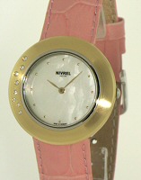 Nivrel Ladies wrist watch. Swiss quartz movement, stainless steel case with 8 diamonds on 18kt gold bezel, white Mother-of-Pearl dial, pink color leather watch strap.