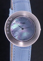 Nivrel Ladies wrist watch. Swiss quartz movement, stainless steel case with 5 diamonds, blue Mother-of-Pearl dial, blue color leather watch strap.