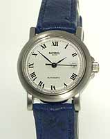 Nivrel Ladies Mechanical wrist watch. Swiss ETA Automatic movement with 25 jewels. Solid Stainless steel case with observation case back. White dial with Roman printed numerals and date calendar. Blue ostrich leather watch band.