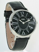 Nivrel Ladies Quartz wrist watch. Swiss Quartz movement, stainless steel elegantly curved large case. Black Sunburst Guilloche textured dial with large Arabic and Roman printed numerals. Black leather watch band.