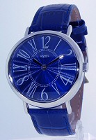 Nivrel Ladies Quartz wrist watch. Swiss Quartz movement, stainless steel elegantly curved large case. Blue Sunburst Guilloche textured dial with large Arabic and Roman printed numerals. Blue leather watch band.