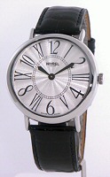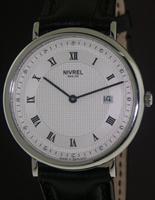 Nivrel Ladies Quartz wrist watch. Swiss Quartz movement, stainless steel elegantly curved large case. Silver Sunburst Guilloche textured dial with large Arabic and Roman printed numerals. Black leather watch band.