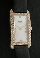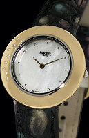 Nivrel Ladies wrist watch. Swiss quartz movement, stainless steel case with 8 diamonds on 18kt yellow gold bezel, white Mother-of-Pearl dial, crocodile leather watch strap.