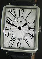 Nivrel Ladies Quartz wrist watch. Swiss Quartz movement, rectangular stainless steel curved large case. Silver color Sunburst Guilloche textured dial with large Arabic and Roman printed numerals. Black leather watch band.