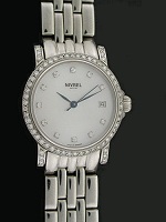 Nivrel Ladies Mechanical wrist watch. Swiss ETA Automatic movement with Cotes de Geneve hand enhancements. Polished finish Solid Stainless steel case with diamonds on the bezel and lugs. White Mother-of-Pearl dial with date calendar and diamond markers. Polished finish Solid Stainless steel watch bracelet.