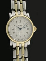 Nivrel Ladies Mechanical wrist watch. Swiss ETA Automatic movement with 25 jewels and Cotes de Geneve hand enhancements. Polished finish Solid Stainless steel case with 18kt gold bezel. Silver Guilloche textured dial with Roman printed numerals and date calendar. Polished finish Solid Stainless steel watch bracelet with Gold plated accents