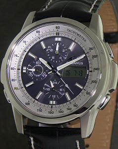 Oceanus OCW500TLA-7AV Solar, Atomic Radio Controlled chronograph watch from Oceanus Chronograph Collection. Features Oceanus Atomic Timekeeping and Tough Solar Power Systems. Watch Functions: Analog/Digital movement; Chronograph; 5 Daily Alarms; Dual Time; Stopwatch; 12/24 hours format; Auto calendar; Power Saving. Titanium case, silver color bezel with Tachymeter scale, luminous hands and markers on black color dial with digital display, black leather watch strap.