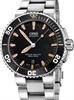 Oris Aquis Divers wrist watch. 300m Water resistant. Swiss Automatic movement, stainless steel case with black ceramic uni-directional 0-60 rotating bezel, screw-down crown, black dial with orange luminous hands and markers, date calendar, sapphire anti-reflective scratch-proof crystal, stainless steel bracelet.