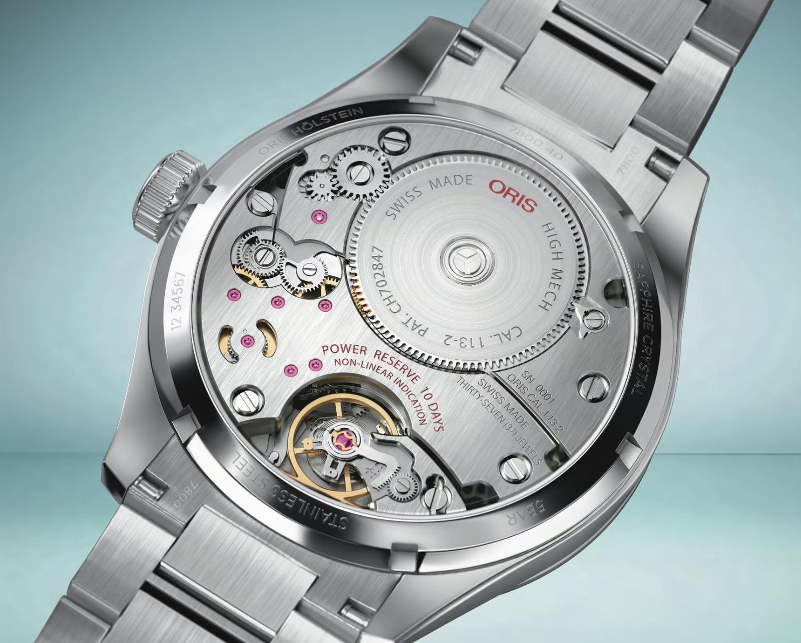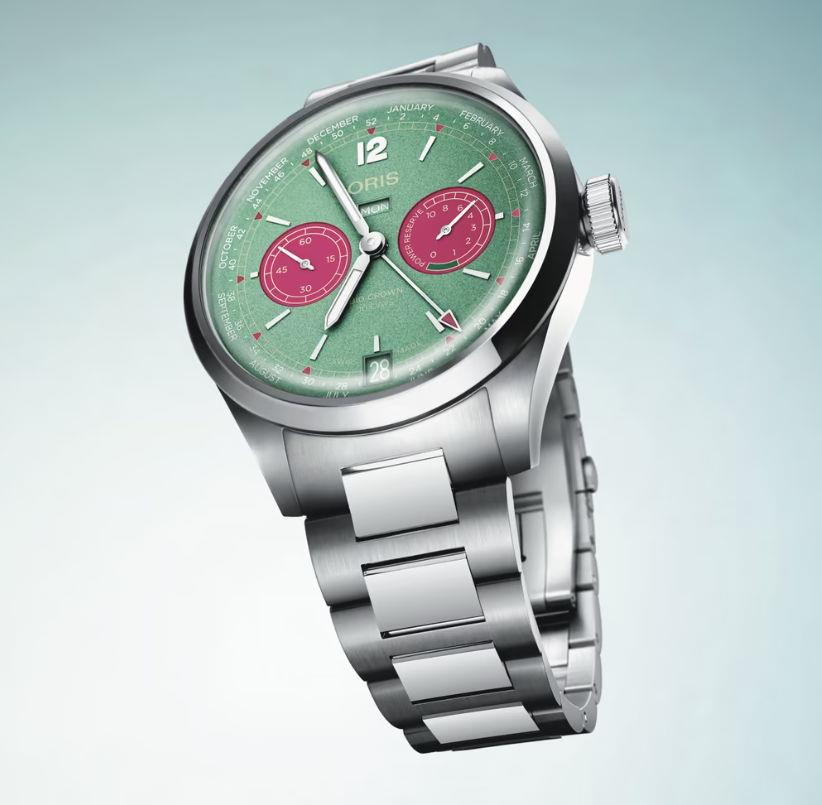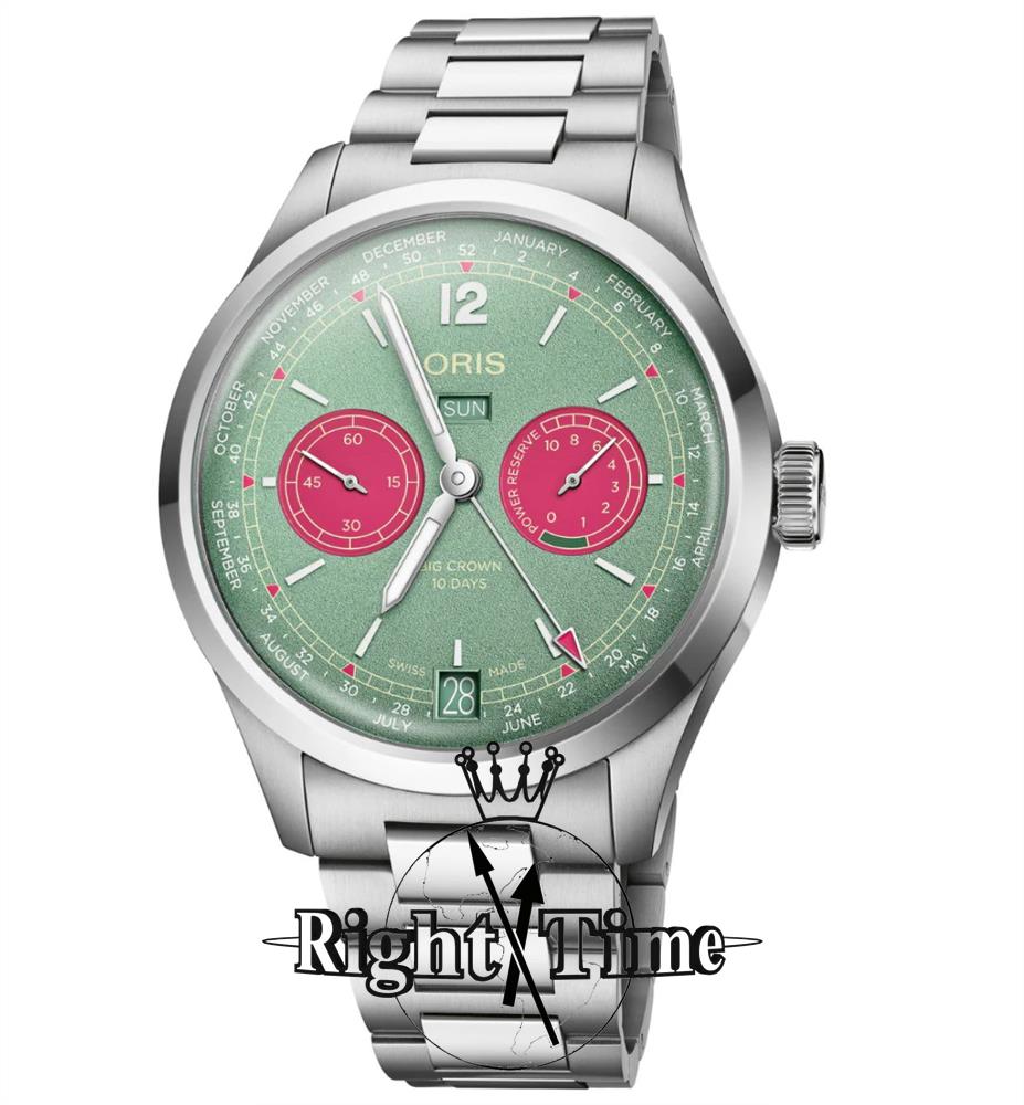 Oris Big Crown Calibre 113. Powered by in-house developed Calibre 113 manual wind movement with 10 days power reserve indicator, day/date/month, and small seconds platform. Stainless steel case with bracelet. Hands are coated with SupeLumiova. Green dial with pink sub-dials. Observation case back.