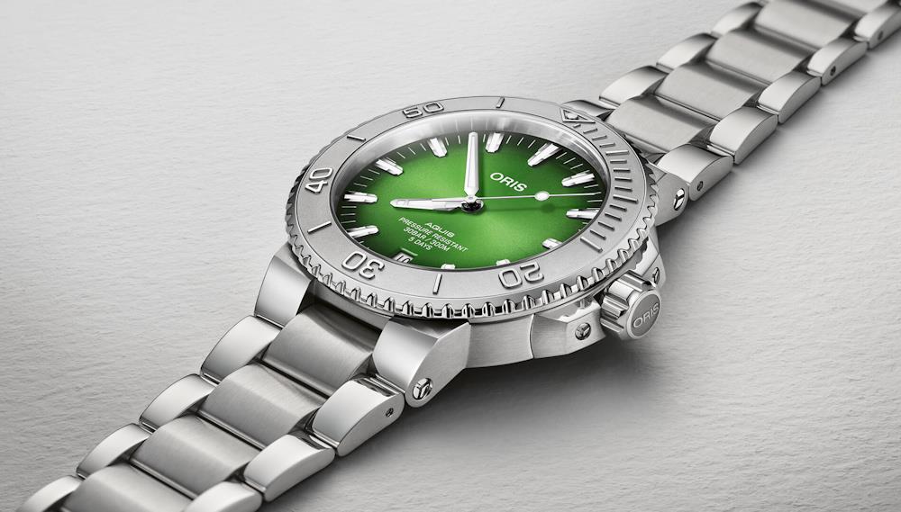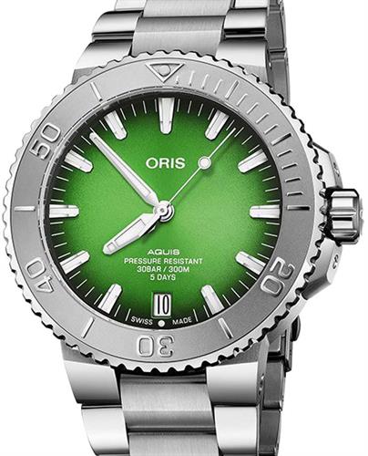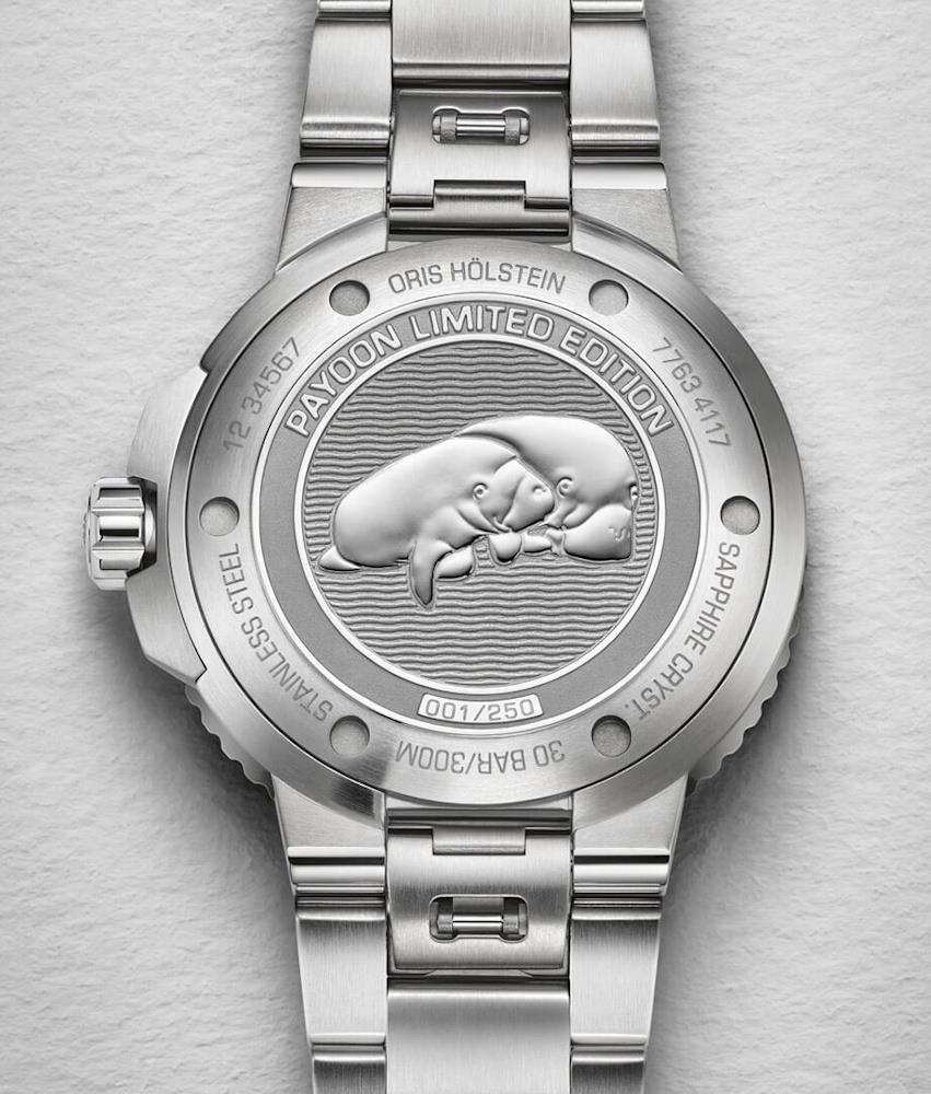 Oris Payoon Limited Edition of 250 pieces. Model 01 400 7763 4117-SET. Swiss made Oris Caliber 400 automatic movement features a 5 day power reserve and a massive 10 year factory warranty. Green dial inspired by the color of the Koh Libong water. A grey relief bezel reflective of dugong skin color. Case back is engraved with a dugong mother and baby.