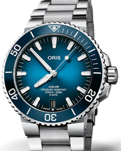 Oris Aquis Diver model 01 400 7763 4135. Powered by the phenomenal Oris Caliber 400 automatic movement. Made in house by Oris in Switzerland, this new movement has 21 jewels and a massive 5 day power reserve. The movement is housed in a stainless steel case on a dual-finish bracelet. Vibrant blue dial with luminous hands and markers. Blue color ceramic uni-directional bezel. Sapphire scratch resistant crystal. Water resistant to 300 meters.