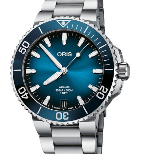 Oris Aquis Diver model 01 400 7769 4135-07 8 22 09PEB. Powered by the phenomenal Oris Caliber 400 automatic movement. Made in house by Oris in Switzerland, this new movement has 21 jewels and a massive 5 day power reserve. The movement is housed in a stainless steel case on a bracelet. Vibrant blue dial with luminous hands and markers. Blue color ceramic uni-directional bezel. Sapphire scratch resistant crystal. Water resistant to 300 meters.