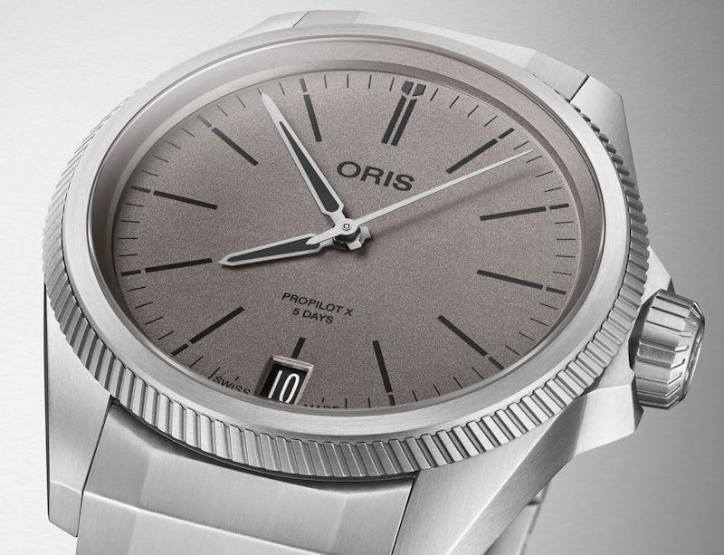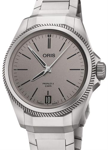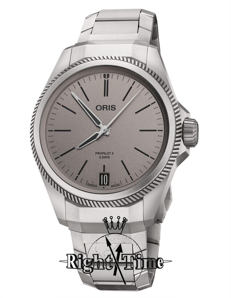 Oris Big Crown ProPilot X model 01 400 7778 7153. In-house Oris Calibre 400 automatic movement featuring a 5 day power reserve and a massive 10 year warranty. Ultra-light titanium case and bracelet. Unique grey colored dial with printed white markers and luminous steel hands sits under a sapphire scratch-resistant crystal. Water resistant to 100 meters.