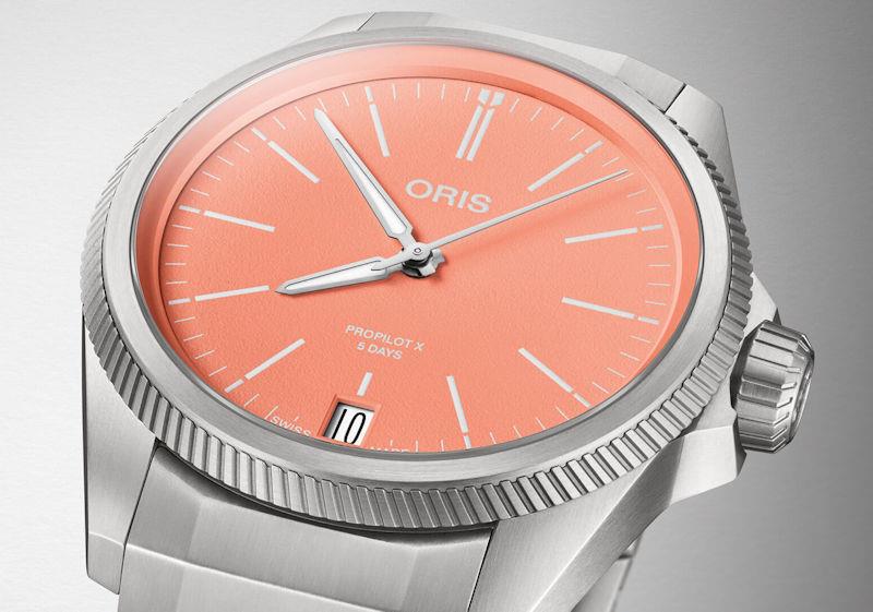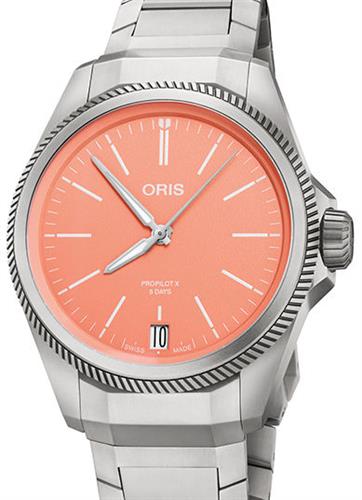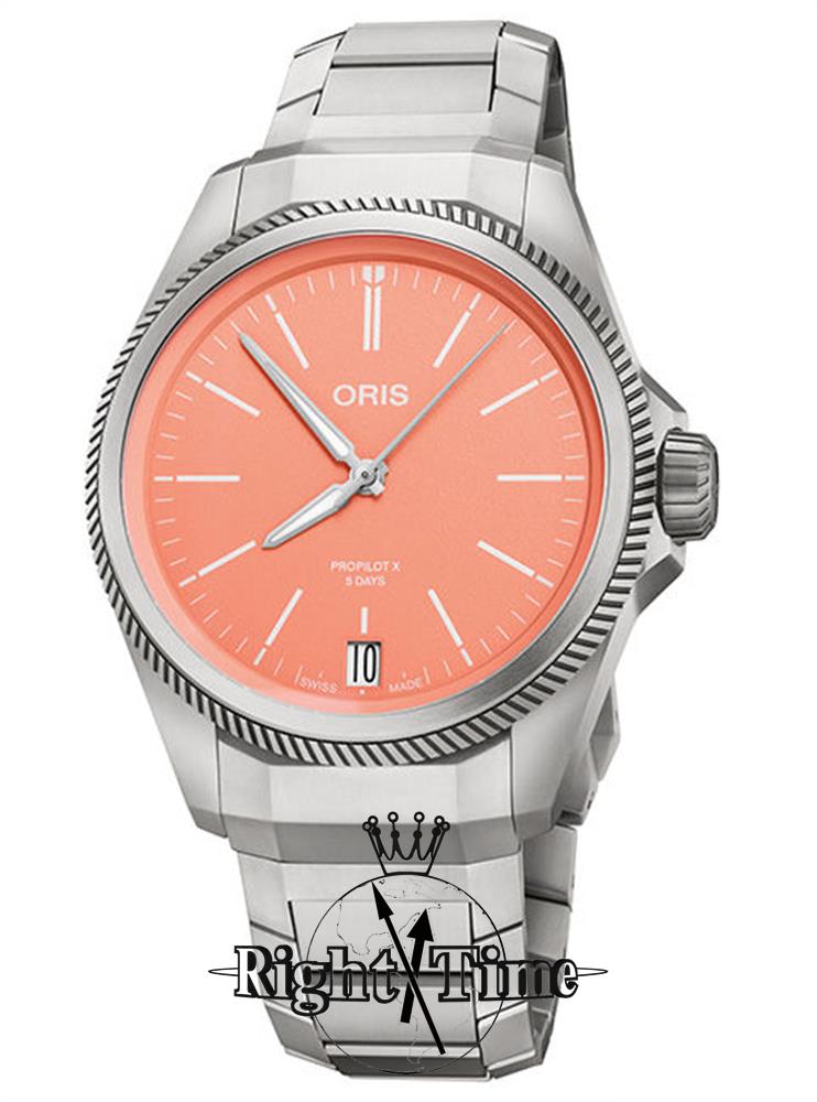 Oris Big Crown ProPilot X model 01 400 7778 7158. In-house Oris Calibre 400 automatic movement featuring a 5 day power reserve and a massive 10 year warranty. Ultra-light titanium case and bracelet. Unique salmon colored dial with printed white markers and luminous steel hands sits under a sapphire scratch-resistant crystal. Water resistant to 100 meters.