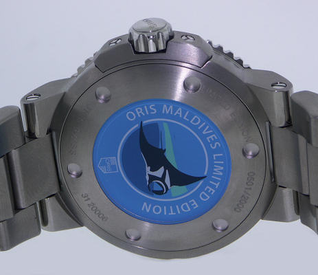 Oris Maldives Limited Edition diver watch. Water resistant to 300 meters. Solid titanium case with blue ceramic ring ob the bezel. Swiss ETA 2836 automatic movement. Blue dial with orange luminous markers, date calendar and small second sub-dial. Titanium bracelet. Factory model number 0164376547185- Set MB