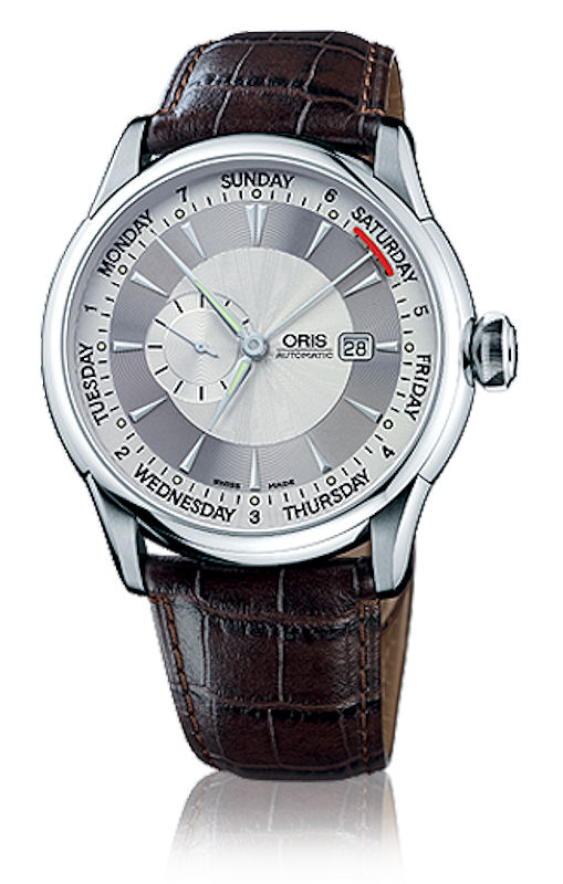 Oris Artelier Small Second Pointer Day watch powered by Swiss ETA Cal. 2836-2 25 jewels Auto-wind movement. Gorgeous silver color textured dial with days of the week printed around. Leather band.