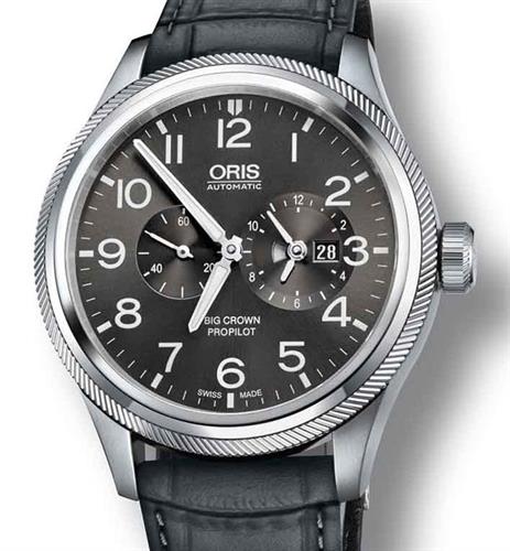 Oris Big Crown Pro Pilot series. Two time zone World Timer will show you local time, time at home with day/night indicator and change over from one time zone to another is done by simply twisting the bezel slightly either direction to go 1 hour at the time around the world. 45mm satin finish solid stainless steel case with black leather band and deployant clasp. Scratch resistant sapphire crystal.