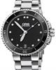 Oris Aquis Divers wrist watch. 300m Water resistant. Swiss Automatic movement, stainless steel case with black ceramic uni-directional 0-60 rotating bezel, screw-down crown, black dial with luminous hands and diamond markers, date calendar, sapphire anti-reflective scratch-proof crystal, stainless steel bracelet.