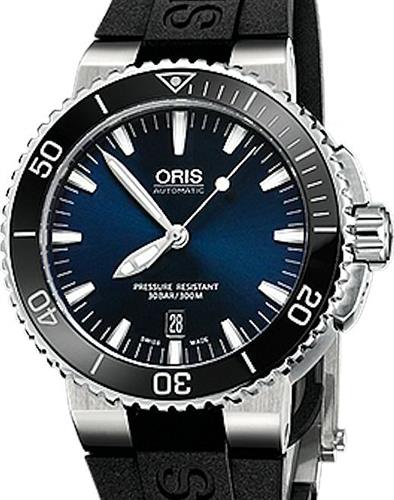 Oris Aquis Divers wrist watch. 300m Water resistant. Swiss Automatic movement, stainless steel 43mm case with black ceramic uni-directional 0-60 rotating bezel, screw-down crown, blue dial with luminous hands and markers, date calendar, sapphire anti-reflective scratch-proof crystal, black rubber watch band.
