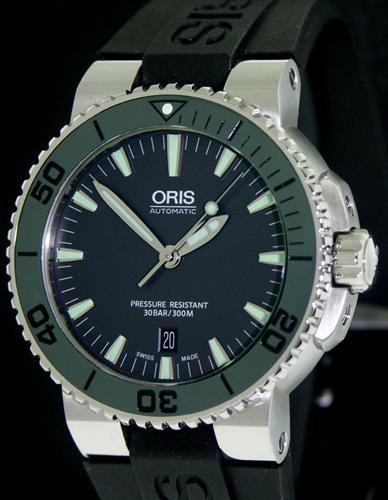 Oris Aquis Divers wrist watch. 300m Water resistant. Swiss Automatic movement, stainless steel case with green ceramic uni-directional 0-60 rotating bezel, screw-down crown, gray dial with luminous hands and markers, date calendar, sapphire anti-reflective scratch-proof crystal, rubberband.